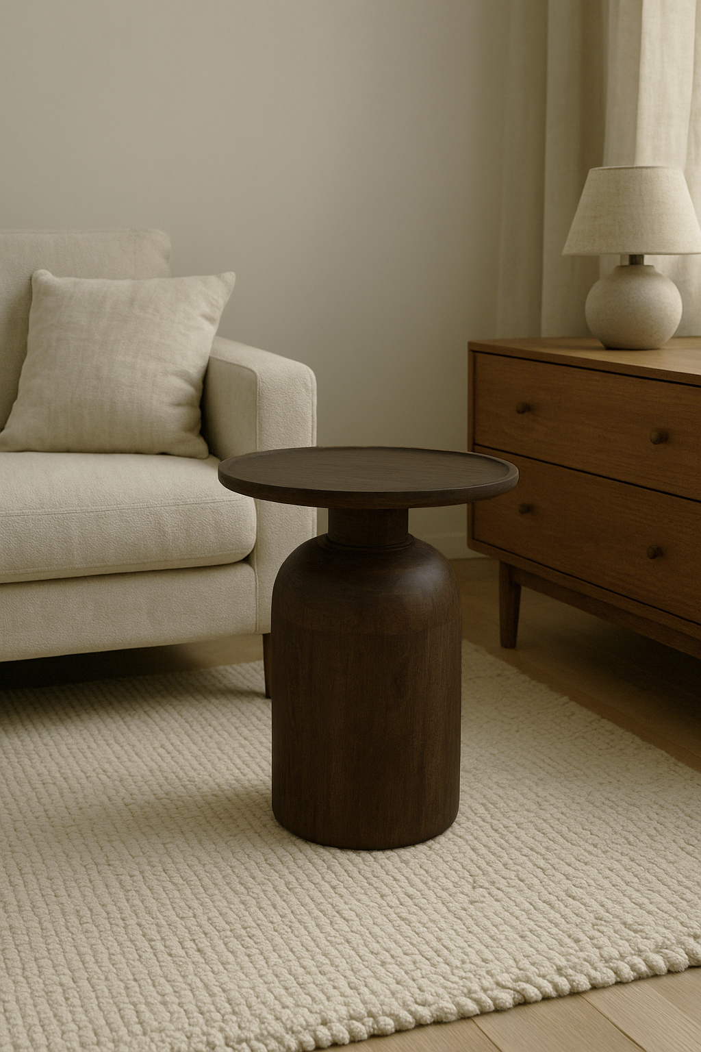 Con un diseño sobrio y funcional, esta mesa auxiliar de madera en tono oscuro es una pieza versátil que se adapta a cualquier ambiente. Su estética elegante y su estructura robusta la convierten en una opción ideal como mesa de apoyo junto al sofá, en el dormitorio o en un rincón de lectura.